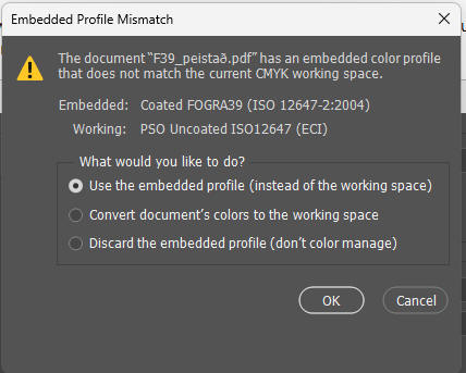 This is possible in most mainstream applications for design such as Adobe Photoshop, Adobe Indesign, Adobe Illustrator, Affinity Designer, Affinity Publisher and CorelDraw. It is even easy to use the SMS sRGB colours in Microsoft Powerpoint if you are concerned about the colour of your slideshows. In this example we used good old Macromedia Freehand - see example here above. If you have a problem using SMS colours in your application, please contact support@spotmatchingsystem.com and we will do our best to assist you, even if you need a work-around. Finish your job and safe it and then save a copy as "name_of_your_choice_web_version" as png with the sRGB profile embedded in the case of web graphics, PDF if you are working for print (and don't forget to use high resolution images for print). In the case of web/sRGB format, email the file or publish it online for your customer's visual approval. Keep in mind that since the colours are in this case sRGB format, your customer should in most cases be able to make up his or her mind by viewing your creation on his or her (sRGB) smartphone or tablet. Again it should be emphasized that for accurate colour matching on screen, the screen must be calibrated regularly, - every 1-2 weeks. Do it Yourself - instructions on how to create jobs using SMS colours - from A-Z. If you don't want to start by creating your job in web (sRGB) format to show to your customer but would rather like to go right to designing for print - and then print out your proofs to show to your customer, you can either order your SMS colours for CMYK from Spot-Nordic, - for instance the FOGRA39 version of your SMS colour palette ready for print - or you can convert your SMS colours yourself to your print colour gamut(s) in a few easy steps- see detailed step-by-step instructions on how to create a new SMS job and do you own colour conversions here. Included in this presentation are instructions on how to locate the closest Pantone colour(s) to your SMS colour(s), - which can be useful if Pantone spot colours are an essential part of your visual brand identity. NEW: (June 2024): Use your SMS colours in ASE format directly within your colour space for one-offs. We strongly recommend that you do the step-by-step training to familiarize yourself with the way SMS colours should be converted correctly from one colour space (sRGB) to another, enabling you to do SMS brand design. We actually recommend that even colour experts with decades of experience working with icc profiles and doing icc colour management do our SMS READY Expert training (see www.spotmatchingsystem.com/experts. Once you have gotten used to working with SMS colours, there is a shortcut for you to use SMS colours in design, - say if you only need to use them for a one-off print job - or even when you are beginning to work for a new SMS customer: We tested this method on an Affinity Designer 2 v. 2.6 on a PC. First of all (like always) create a a new sRGB job. Set your RGB to sRGB (default for SMS work). Use the ASE colour palette - currently only included with the Standard v6 and MAX v6 colour palettes to select your colours. For your own convenience, be sure to write the name of the SMS colours you use for the job. We recommend that you import the SMS bitmap colour cubes in sRGB format and place them within the workspace - but this is not essential. We use those bitmaps for two purposes: To ensure that the correct SMS colours are being used - and to doublecheck that the colours are correct. Finish your job and then save the job in Affinity Designer format: Name of customer_job_sRGB for web, - or something like that. Now, if you need to use some - or all of your design for printing: Close your sRGB document. Set your rendering intent to Absolute Colorimetric Rendering Intent, - just like we did in the SMS step-by-step training. Set your CMYK space to the destination - say Fogra 39 (ISO Coated v2), if you want to print in CMYK on coated paper to Fogra 39 standards. Create a new CMYK document with the working CMYK space selected. Open your sRGB document and simply copy the parts of your layout that you want to print and paste them into the CMYK document. If you imported the bitmap SMS colour cubes that you created using Adobe Photoshop in sRGB to your design app workspace (Affinity Designer in our test), instead of manually replacing them with CMYK format SMS colour cubes in bitmap format - see step-by-step training, copy them along with your graphics into the new CMYK document. Finish your document and save it as Name of customer_job_Fogra39. Now export the job as PDF. Pick a Press-Ready preset. Make sure to Rasterize Everything when you export to CMYK PDF and make sure that the CMYK icc profile is embedded. Most likely - at least if you are working on a Mac, you also have to check a box where it says "Convert color spaces" - if you are using Affinity Design 2, version 2.6 or higher. Make sure the workspace icc profile is embedded. It is then a good idea to save a new preset called "SMS for CMYK" or something like that. If you want to be 100% sure you didn't do anything wrong, open your SMS colour palette in Adobe Photoshop in PDF format and manually compare the LAB values of the colours you used for your job to the LAB values of your colours in your original SMS colour palette you should have in PDF format (sRGB). When you open your new job in PDF format in Adobe Photoshop, on opening you should first see a promt window that should look something like this:
