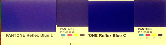 uncoated paper for official use. I hate to admit it but this is actually not bad, even if it will not look like the original Reflex Blue of course (please refer to your Pantone CMYK C guide, page 102, colour P 102-8-C (97%c81%m) and compare it to the PANTONE FORMULA GUIDE C. Now, lets have a look at what the CMYK colour variation looks like, when printed on uncoated paper, - lets say in a newspaper or on an uncoated flyer, invitation card, envelope, letterhead etc. It will look approx something like this: