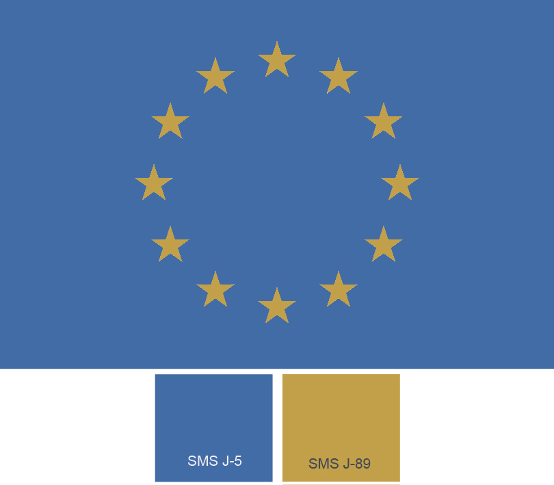 The rule of thumb is: You can usually find or get a custom mix of a colour from existing spot colour systems that is really close to a known CMYK colour combination and it is at the same time usually very hard to find a modestly correct CMYK colour that looks like a colour picked from most spot colour matching systems in the market. Addition, June 2024 IK To put my money where my mouth is - and instead of just ranting about the design of the EU flag, which was of course designed many years before the Spot Matching System came along, using methods that at that time were standard procedures for brand design, here is a proposed version of the EU flag, where I use Standard SMS colours from the latest version of the system - version 6. This is by no means and official proposal, - although I would of course encourage the EU to consider the colours of the Spot Matching System to enable easy reproduction of their colours to international standards. So here is an idea of what the EU flag could look like, - say if the designers wanted sky blue + golden stars. This is of course the colour of the sky over Iceland on a brisk, automn day, nota bene, since the Spot Matching System is Icelandic.